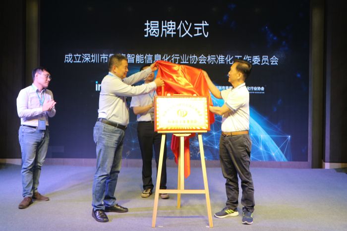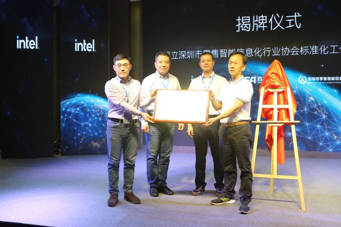 本屆峰會進行了深圳市零售智能信息化行業協會標準化工作委員會(下文簡稱為:標委會)的揭牌儀式。李洪明先生、謝青山先生為標委會揭牌,并將牌匾授予深圳市零售智能信息化行業協會的程永生副秘書長,彭建真先生作為見證人。