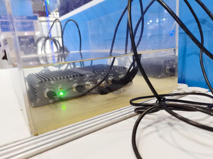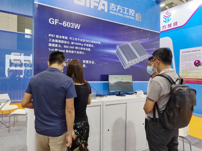 工控機展臺:展出了應用于多個場景的嵌入式無風扇工控機,其中GF-603W強固型工控機進行了防水動態展示。